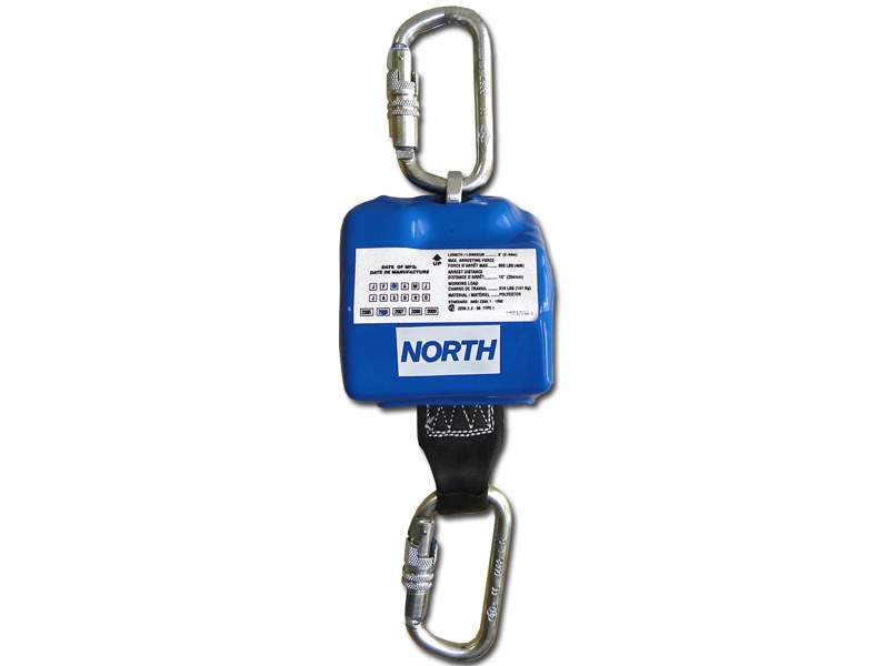 Dispositivo trava queda de segurança de movimentação retrátil, fabricado em fita de poliéster 100% poliamida, 45 mm de largura, 2500 mm de comprimento. Possui alça superior na qual se acopla um mosquetão, confeccionado em aço forjado, dupla trava de segurança, dispositivo para o engate no ponto de ancoragem do cinto de segurança, absorvedor de impacto, tipo giratório, fixo ao cabo retrátil e um mosquetão em aço forjado, dupla trava de segurança fixo ao absorvedor de impacto.